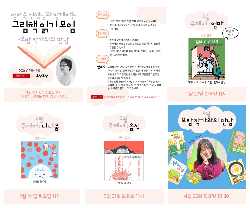 * 진행 : "엄혜숙 선생님"과 주제별 그림책을 함께 읽고 마음을 나누어요.